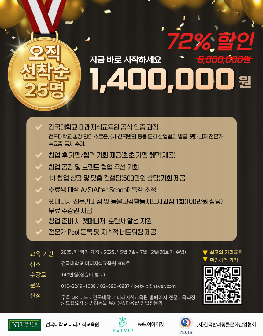 건국대학교 미래지식교육원 전문교육 <반려동물 유치원&미용샵 창업전문가 1기>의 수강생을 모집하고 있습니다.